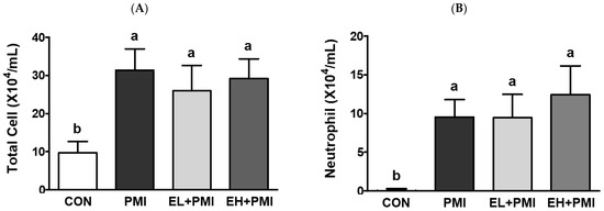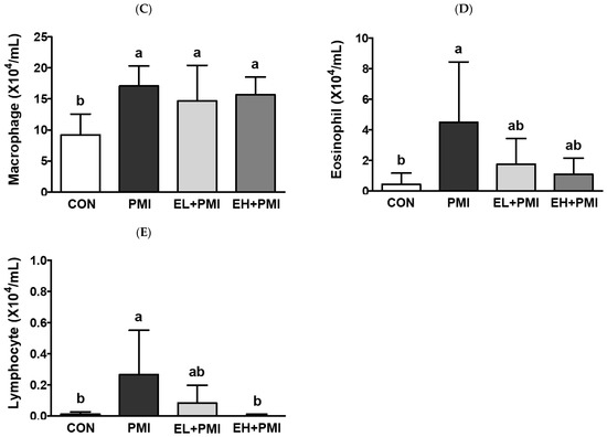 According to our previous findings, PM instillation directly induces pulmonary inflammatory responses in rodents [20]. Similar to our previous findings, in this study, PM exposure resulted in black particles or black pigment-laden alveolar macrophages in the alveolar areas (Figure 2B, blue arrows). In addition, infiltrated inflammatory cells were noted in the peribronchiolar, perivascular, and interstitial regions (Figure 2B, red arrows), similar to our previous reports [20]. Pulmonary PM loading induces infiltration of immune cells and cytokine secretion in the BALF [20], and we postulated that EA treatment would attenuate the recruitment of immune cells and cytokine secretion in the BALF. As expected, PM exposure markedly increased the total number of immune cells and inflammatory cytokines in the BALF. After PM exposure, total immune cells in the BALF were increased ~3-fold compared with CON with induction of the absolute number of neutrophils and macrophages (Figure 3A–C). In addition, a significant increase in the number of eosinophils and lymphocytes was induced in the PMI group compared with the CON group (Figure 3D,E). However, the total number of immune cells was not ameliorated in the EL + PMI and EH + PMI groups compared with the PMI group (Figure 3A–C), similar to the results in our previous study on quercetin treatment [21]. In contrast, the number of eosinophils and lymphocytes gradually decreased in the EA-treated groups compared with that in the PMI group in an EA dose-dependent manner (Figure 3D,E).