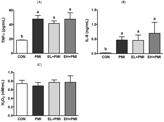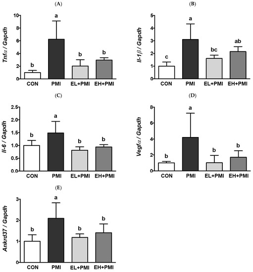 EA treatment did not reduce the recruitment of immune cells or cytokine secretion in the BALF. However, in our previous study, we observed that quercetin exerted anti-inflammatory effects by decreasing pulmonary cytokine mRNA expression [21]. Similarly, pulmonary cytokine mRNA expression was increased in the PMI group compared with that in the CON group. The mRNA expression of pulmonary cytokines such as Tnfα, Il-1b, and Il-6 increased 6.2-, 3.1-, and 1.4-fold, respectively, in the PMI group compared with the CON group (Figure 5A–C). However, EA treatment decreased PM-induced pulmonary Tnfα mRNA expression by 1.9-fold and 2.9-fold in the EL + PMI and EH + PMI groups, respectively, compared with the PMI group (Figure 5A). In addition, EA treatment remarkably reduced PM-induced pulmonary Il-1b mRNA expression by 1.6-fold and 2.1-fold in the EL + PMI and EH + PMI groups, respectively, compared with the PMI group (Figure 5B). Furthermore, EA treatment also reduced PM-induced pulmonary Il-6 mRNA expression by 0.8-fold and 0.9-fold in the EL + PMI and EH + PMI groups, respectively, compared with the PMI group (Figure 5C).