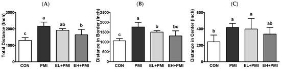 To evaluate the behavioral effects of EA on PM-exposed mice, an OFT was implemented. In this study, mice in the PMI group exhibited hyperactivity compared with the CON group. The total moving distance, including both the outer and central parts of the plexiglass container, were increased in the PMI group compared with the CON group (Figure 6A–C). Interestingly, PM-treated mice spent a significantly increased amount of time in the central area, whereas quercetin treatment decreased [21]; however, in this experiment, all treatments did not significantly alter the time spent in the central part of the plexiglass container (Figure 6F). Although there were no statistical differences, PM exposure increased the time spent in the central part of the plexiglass container by approximately 30.4% (p = 0.19) compared with the CON group, while EL + PMI and EH + PMI decreased the central staying time by approximately 75.5% and 85.6%, respectively, compared with the PMI group. In conjunction with, in all groups, no significant changes were noted in the staying time on the border of the plexiglass container (Figure 6E). The total movement speed of the PMI group was significantly elevated with hyperactivity (mean and maximum speed) at the border of the plexiglass container (Figure 6G,H,J). For the PMI group, the maximum speed at the central area did not significantly increase (Figure 6K); however, the mean speed at the central area significantly increased (Figure 6I). In contrast, in the EL + PMI and EH + PMI groups, the hyperactivity observed in the PMI group was reduced. Subsequently, we proposed that amelioration of PM-induced hyperactivity with EA treatment may involve serum corticosterone, a gold standard to assess stress levels. To answer our extended research question, serum corticosterone levels were analyzed using an ELISA kit. However, there were no distinguishable differences in serum corticosterone levels among the experimental groups (Figure 6L), as in our previous study [21].