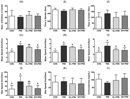 Open field test results and serum corticosterone levels after ellagic acid (EA) pretreatment and particulate matter (PM) instillation. C57BL/6 mice were orally pretreated with ellagic acid (EL; 20 mg/kg or EH; 100 mg/kg) for 7 days, and then PM (5 mg/kg) was intratracheally administrated for 7 days with or without ellagic acid pretreatment: (A) total distance moved, (B) distance moved in border, (C) distance moved in center, (D) number of entries into center, (E) time spent in border, (F) time spent in center, (G) the total mean speed, (H) mean speed in border, (I) mean speed in center, (J) max speed in border, (K) max speed in center of mice within 10 min of the open field test, and (L) serum corticosterone measured 1 day after the OFT. Values represent the mean ± standard deviation (SD) for each group (n = 8). Data passed the D’Agostino and Pearson omnibus test; one-way ANOVA with Tukey’s post hoc test was applied. Lowercase letters indicate significant differences. p < 0.05.