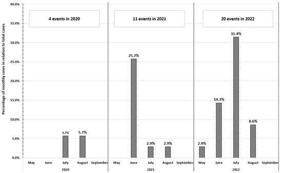 In terms of the distribution of events over time, four heat-related illnesses/injuries were reported in 2020, corresponding to 11.4% of the events that occurred in the three-year period considered (Figure 1). In 2021, 11 cases were reported (31.4% of the events that occurred in the three-year period 2020–2022); of these, almost all (n = 9; 81.8%) occurred during a heatwave in June. Finally, 20 events (57.1% of the events that occurred in the three-year period) were reported in 2022, particularly during heatwaves in July, when 11 events were reported (55.0% of events occurred in 2022 and 31.4% of events occurred in 2020–2022).