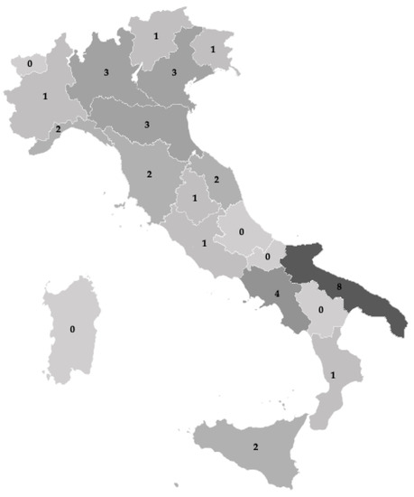 Events occurred throughout Italy, except for five regions (Aosta Valley, Abruzzo, Molise, Basilicata, Sardinia), where no events were reported in the online newspapers. Apulia recorded the highest number of heat-related illnesses/injuries in the examined period (n = 8; 22.9%) (Figure 2).