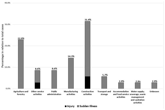 The highest number of events was reported in the construction sector (n = 11; 31.4% of all recorded events), followed by agriculture and forestry (n = 8; 22.9% of all recorded events) and manufacturing activities (14.3%). Traumatic events (injuries) were recorded in construction activities and for an airport service worker (included in “other service activities”) (Figure 3).