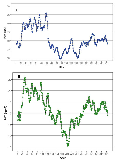 The highest mean 10-day values of PM10 were during the period of 23–133 day of year (DOY) (23 January–12 May) and the lowest values were during the period of 134–260 DOY (13 May–16 September) (Figure 1A). The seasonal dynamic of the 10-day average concentration of NO2 was similar to that of PM10 (Figure 1B).