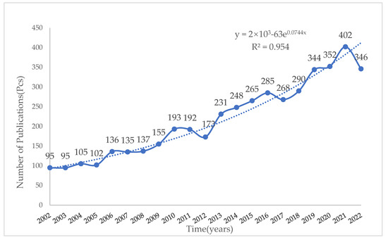The growth trend of the field of study is predicted by compiling year-by-year statistics of the number of articles published in the field of study and by means of a Price’s curve. The growth of the scientific literature is exponentially related to time, and the closer the coefficient of determination of the trend line is to 1, the better the fit is. It also indicates the faster growth rate of the number of publications in a given subject area in the future [29] (Figure 1). Figure 1 shows that the sample paper load versus time is given by the equation y = 2×103-63e0.0744x, and its trend line determinant is R2 = 0.954. It reveals that the number of publications in this research area show a clear exponential growth trend as time advances. The exponential line of publications in recent years, with an R-squared value of R2 = 0.954, represents its reliability. The closer the R-squared value is to 1, the better the fit of the exponential line to the figures. This demonstrates the reliability of the equation in predicting the number of articles published in this research area. Moreover, it indicates that the development of the field of landscape camping and bird diversity research is accelerating.