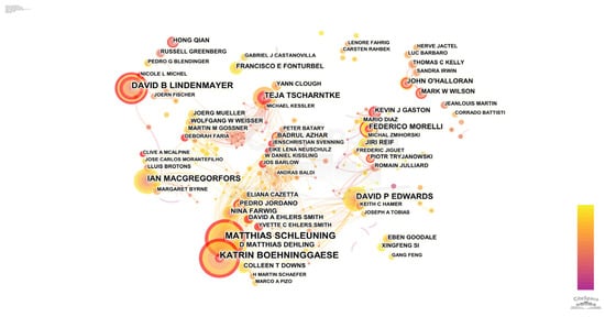 Teja Tscharntke (18, 0.04) is the author with the highest centrality and the highest impact in the published literature. His research focuses on the influence of landscape features on the biodiversity of plants, birds, and insects, the summary of activity patterns of birds, bats, etc., in different landscapes, and the analysis of the importance of landscape benefits generated by landscape factors on bird diversity [47,48,49,50]. The second major research network consists of authors such as Ian Macgregorfors (21) and his associated team. In addition, influential articles by authors such as Jiri Reif (10, 0.04) form a more focused collaborative network with authors such as Federico Morelli (14, 0.01).