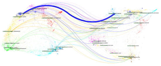 A dual-map overlay is an analysis method that shows the domain-level concentration of references by reference path [31]. Figure 3 was created using CiteSpace software with a source circle size = 0 and target circle size = 0. Then, the citation lines were merged by the z-score function to obtain Figure 3. The z-score function allows the highlighting of strong connections, making them easier to identify. Figure 3 shows that there is only one major citation path in this research area, and Table 3 shows this path and trends along with the names of the citation and citation regions, where the z-score is rounded to the nearest thousand. Figure 3 and Table 3 show that the field of study has evolved from ecology, earth, and marine, with a gradual shift to plant, ecology, and zoology. The literature in the fields of ecology, earth and oceans is fundamental to the field of landscape architecture and bird diversity research.