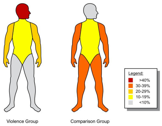 Shown are the frequencies (in percent) of injuries to the respective body regions affected in a direct comparison of the groups (left = violence group; right = comparison group). The trunk region includes the entire spine, thorax, abdomen and pelvis. Copyright is held by the corresponding author.