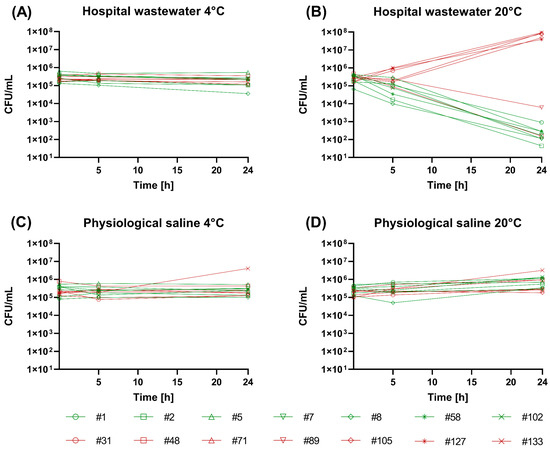 Time-kill assay of antibiotic-susceptible (green) and multi-resistant (red) E. coli strains. The individual strains (denoted by different numbers and symbols) were exposed to either hospital wastewater (A,B) or physiological saline (C,D) at 4 °C (A,C), mimicking conditions that can be obtained during wastewater sampling, or at 20 °C (B,D), identical to the conditions used by Kraupner et al. [22]. CFUs were assessed on MH agar after 5 h and 24 h incubation as well as at the start of the experiment (0 h). The value for strain #89 at 5 h in (B) is a minimum assessment since there was overgrowth on the MH plates with the highest inoculated dilution.