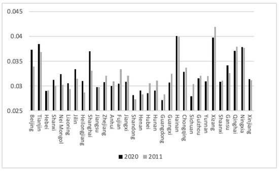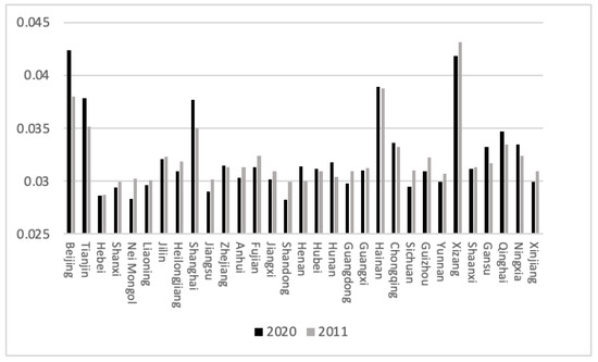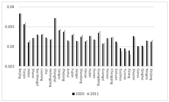 Figure 1 shows that the proportion of HDI in Guizhou, Yunnan, Xizang, Shaanxi and Qinghai increased in the target year range. The HDI increase in these five provinces was greater than that of other provinces, among which Guizhou and Yunnan paid more attention to health from 2011 to 2020, and Xizang attached great importance to education, which was the reason for the rapid growth of HDI in these three provinces. The proportion of HDI in Tianjin, Hebei, Zhejiang, Anhui, Shandong, Henan and Xinjiang decreased to varying degrees. The HDI of these provinces did increase, but the growth rate was slower than that of the other provinces. Among them, the five provinces of Tianjin, Hebei, Zhejiang, Shandong and Xinjiang, which had a large decline, encountered bottlenecks in economic development, and the per capita GDP after the deflation of the GDP index fell in the target year range. The proportion of HDI in most other provinces, such as Beijing and Shanxi, did not change substantially in the target year range and was in a state of steady development.