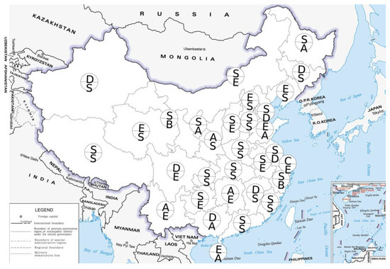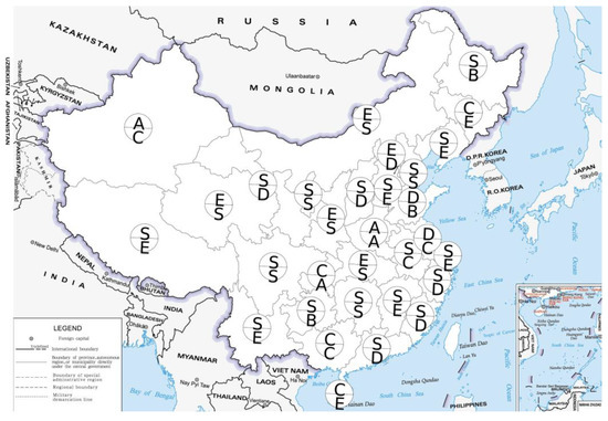 The mutualism degree index was calculated based on the force-on index obtained above. This study combined these two types of indices and used the ranking criteria given in Table 1 to analyze the industrial and domestic pollution ranks of 31 provinces from 2011 to 2015 and from 2016 to 2020. The letters above and below each province in Figure 4 and Figure 5 indicate the pollution ranks from 2011 to 2015 and from 2016 to 2020. The S-level represents high-level collaborative symbiosis, the A- and B-levels represent higher-level coordinated symbiosis, the C- and D-levels represent lower-level coordinated symbiosis, and the E-level represents low-level coordinated symbiosis.