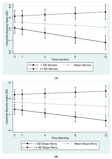 According to the multilevel model (observations nested within participants) with a random intercept and slope, the interactions between time and the slope of all worry variables (see Table 3, all ps ≤ 0.01) were significant. Specifically, over time, those who experienced more COVID-19 worries also reported more severe insomnia severity (see Figure 1A,B, for examples, though the pattern was identical for all worry outcomes). However, a reverse multilevel model also demonstrated that there was a significant interaction between time and the slope of ISI on all the worry variables (see Table 4, all ps ≤ 0.01). The inclusion of demographic variables (age, gender, ethnicity, country of origin) did not alter these patterns.