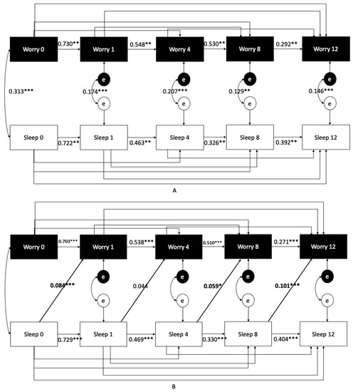 As an extension study of our prior investigation, we followed the same data analytic procedures as in our prior report [10]. In summary, we conducted: (1) cross-sectional multiple logistic regression analyses to predict the severity of insomnia (ISI) based on COVID-19-related exposure worries. (2) Mixed effects multilevel models (observations nested within participants) with a random intercept and slope. (3) A series of cross-lagged panel analyses to directly test the directionality between worry about COVID-19 (using sum scores of the six items to reduce the number of analyses) and ISI severity (Figure Following established procedures for this evaluation [13,14,15,16], we tested five models and the differences in their model fit to evaluate the directionality between the two variables. Detailed descriptions and rationales for each analysis can be seen in our prior report [10].