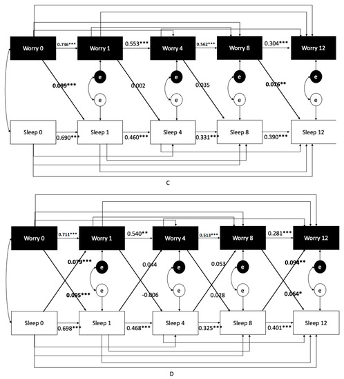 To further elucidate the directionality between worry and insomnia, we conducted a series of cross-lagged panel analyses (Figure 2A–D). As reported in Table 5, increased model fit from Model 2 and Model 3 relative to Model 1, suggesting that cross-lagged paths were significant and should be retained (Column 5, Table 5). Model 4 significantly improved model fit above and beyond Models 2 and 3, suggesting that it is most appropriate to model cross-lagged paths within the same model (Column 5, Table 5). Finally, constraining cross-lagged paths to be equal had significantly worsened model fit than when paths were freely estimated (column 7, Table 5). This finding suggests that the strength of the cross-lagged paths was not equivalent between the constructs. To further support this possibility, the only significant cross-lagged paths in the freely estimated model (Figure 2D) were earlier in the longitudinal model (from baseline to one month) and later in the model (from 8 months to 12 months). In the earlier path, the cross-lagged path from worry to sleep was slightly larger; this was reversed in the later path. Thus, the model was significantly improved when paths could be freely estimated, but both directions appeared to be important.
