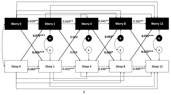 Results of a cross-lagged panel analysis to directly test directionality between Worry (calculated as a total score, a sum of all Worry variables to reduce the number of analyses) and Insomnia Severity Index severity. (A) Model 1 includes only the autoregressive paths. (B) Model 2 adds paths from one construct (sleep at Tn − 1) to the second construct at the subsequent time-point, worry at Tn. (C) Model 3 adds paths in the opposite direction to the autoregressive model: worry at Tn − 1 predicting sleep at Tn. (D) Model 4 is the full model including bidirectional paths (essentially a combination of Models 2 and 3). (E) Model 5 constrains cross-lagged paths to be equal at each time-point. Note: * p < 0.05, ** p < 0.01, *** p < 0.001.