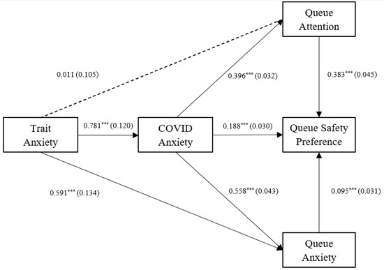 Final path analysis using queue attention and queue anxiety as observed variables. Unstandardised estimates are shown between variables with standard errors in parentheses. *** p < 0.001.