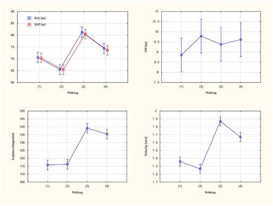 Basic descriptive statistics were calculated for all variables, and the results are presented as mean ± standard deviation. Normality of the distribution was assessed using the Shapiro–Wilk test. Differences in gait parameters between successive walks were assessed with the paired Student’s t-test, or the Wilcoxon test if the data did not follow a normal distribution. Due to multiple comparisons, a Bonferroni correction was applied, and the results were considered statistically significant at p < 0.017. All analyses were performed using TIBCO Statistica® 13.3.0 (StatSoft Poland). The relationships between variables were assessed using the ρ-Spearman’s rank correlation coefficient, with effect size for ρ (rho) being considered according to Cohen’s recommendations (1988) as small effect size for 0.10 ≤ ρ < 0.30, medium effect size for 0.30 ≤ ρ < 0.50, and large effect size for 0.50 ≤ ρ.