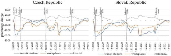 Many studies based research on changes in travel behavior to COVID-19 on daily mobility reports from Google companies [,,]. Google’s COVID-19 community mobility reports [] show a clear decline in mobility patterns during the period of mandatory restrictions in the Czech Republic and Slovakia. The state of emergency began on 12 March 2020 in both countries.