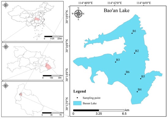 Bao’an Lake is located in southeastern Hubei Province (30°12′ N–30°20′ N, 114°40′–114°48′ E), in the northwestern part of Daye City, at the east of Sanshan Lake, west of Liangzi Lake, south of Bao’an Town, and north of Dongfeng Farm []. It is a typical shallow lake of the Liangzi Lake Group on the south bank of the middle reaches of the Yangtze River []. The watershed area is 285 km2, the lake area is 39.3 km2, the maximum water depth is 3.7 m, and the average water depth is 1.5–2.5 m []. Bao’an Lake was previously connected to Liangzi Lake, but now the two lakes are separated, and the water level is regulated through Donggou Gate. The flow direction of the Bao’an Lake system is from south to north, and the runoff mainly originates from the Huandiqiaogang River, the Bao’andong River, and the Bao’anxi River, while the outflow mainly flows from the Donggou Port in the northwest into Changgang, and subsequently discharges into the Yangtze River through the Fankou Dam [].