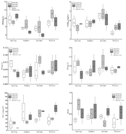 The water quality monitoring results of Bao’an Lake reveal that the water quality indicators greatly fluctuate from season to season. In particular, DO concentrations were minimized in autumn, while the three-year average value of SD was the highest in spring and the lowest in autumn. The maximum mean CODMn concentration was observed in autumn. TP and TN followed the same seasonal trends, with slightly higher concentrations in spring and autumn. Chl-a concentrations were highest in summer and lowest in spring, with the former about 2.39 times higher.