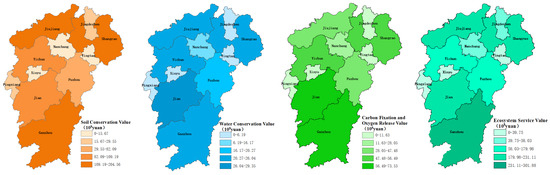 The total value of ecosystem service function for cultivated land in Jiangxi was CNY 148.68 billion in 2018. The value of soil conservation service, CNY 88.69 billion, exceeds others, accounting for 59.65% of the total value of ecosystem services of cultivated land in Jiangxi, as shown in Table 2. From a unit value perspective, the unit value of the ecosystem service function presented a distribution pattern of “increasing from the center on Poyang Lake Basin to the periphery gradually” in Jiangxi province, and was coincident with the distribution of soil conservation, carbon fixation and oxygen release service value per unit. In contrast, the water conservation service value per unit presented a decreasing shape from the center to the surroundings in Jiangxi, as shown in Figure 1. Ganzhou City has the most value per unit of arable land ecosystem service from other cities with 47,243.31 CNY/hm2, followed by Pingxiang (44,991.51 CNY/hm2), Jiujiang (41,406.39 CNY/hm2), Jingdezhen (39,555.85 CNY/hm2), Shangrao (38,465.76 CNY/hm2), Fuzhou (32,005.38 CNY/hm2), Ji’an (31,567.05 CNY/hm2), Yichun (29,235.37 CNY/hm2), Yingtan (27,514.48 CNY/hm2), Xinyu (26,085.81 CNY/hm2) and Nanchang (15,281.73 CNY/hm2). From the total value perspective, Ganzhou City is still the highest value of arable land ecosystem service from other cities with CNY 30.18 billion, followed by Shangrao (CNY 23.11 billion), Jiujiang (CNY 21.41 billion), Ji’an (CNY 20.38 billion), Yichun (CNY 17.99 billion), Fuzhou (CNY 14.98 billion), Nanchang (CNY 5.80 billion), Jingdezhen (CNY 4.73 billion), Pingxiang (CNY 3.97 billion), Yingtan (CNY 3.13 billion) and Xinyu (CNY 2.95 billion), as shown in Table 2 and Figure 2.
