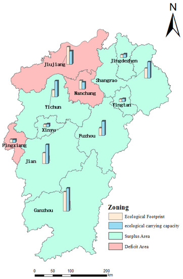 - The cities that need to pay the ecological compensation for cultivated land are Nanchang, Jiujiang and Pingxiang because their ecological footprints are greater than their carrying capacities, at the total amount of CNY 7.94 billion. By contrast, other cities in Jiangxi were the ecological surplus zones, at the total amount of CNY 41.52 billion. This shows that the buyers and suppliers of ecosystem services for cultivated land in Jiangxi can be distinguished using the method in our study.