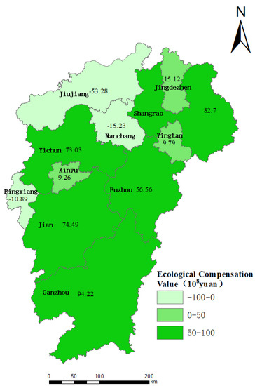 The values of horizontal ecological compensation for cultivated land in the 11 cities of Jiangxi province were calculated according to Formula (17). From the amount of ecological compensation perspective, the three cities with the highest amount of ecological compensation were Ganzhou, Shangrao and Ji’an, and the total amount of compensation in these cities is CNY 25.14 billion, making up about 50.83% of the horizontal ecological compensation values of all cities in Jiangxi, as shown in Figure 4. From the values of ecological profit and loss perspective, payment districts are either the districts with relatively small amounts of farmland and ecological carrying capacity, such as Pingxiang (CNY −1.09 billion) and Nanchang (CNY −1.52 billion), or the districts in which the ecological footprint is relatively higher, e.g., Jiujiang (CNY 5.33 billion). Meanwhile, other cities were the ecological compensation zones, and the total values of ecological compensation in these cities (CNY 41.52 billion) is nearly 5.5 times of the total payment values (CNY 7.45 billion).