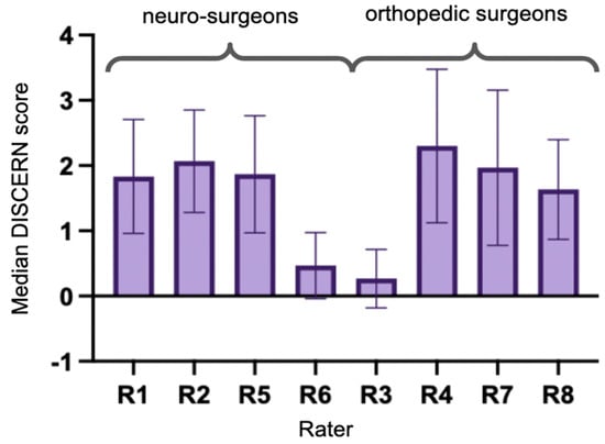 The median DISCERN score was 2. In total, 19.7% were rated with a score of 0, 30.0% with a score of 1, 32.9% with a score of 2, 13.8% with a score of 3, 2.9% with a score of 4, and only 1.3% with a score of 5. Raters R6 (neurosurgeon) and R3 (orthopedic surgeon) differed significantly in their rating from the others (Kruskal–Wallis test