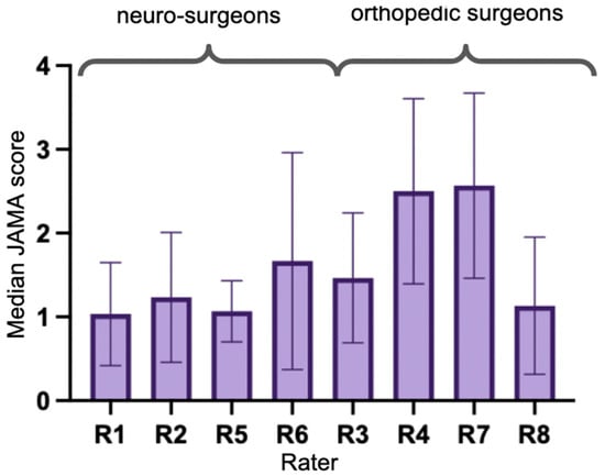 p < 0.001 for combinations with these two raters). Neurosurgeons assigned significantly lower JAMA scores than orthopedic surgeons (Mann–Whitney U test