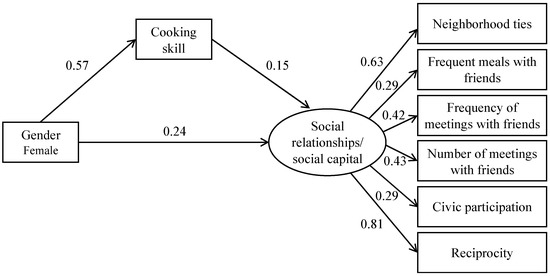 In line with previous studies [10,15,18], we found that women were more likely than men to have strong social relationships and social capital. A nationally representative study in Ukraine showed that the gender difference in bonding social capital, which corresponds to the frequency/number of meetings with friends in our study, was explained by age and income [10]. Using SEM analysis, we found that cooking skill mediated 26% of the association between gender and social capital. Therefore, we have newly identified cooking skills as a factor contributing to explaining the gender differences in social capital.
