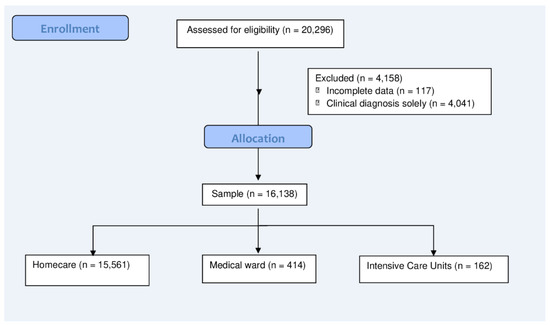 Overall, 20,296 COVID-19 cases were identified during the study period. However, 117 cases were excluded due to the incomplete sociodemographic information of these patients. Furthermore, 4041 cases were excluded since no other information except the clinical diagnosis was available. The final sample included 16,138 patients (Figure 2).