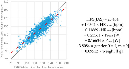 After completing this process, the following input parameters are included in the multiple linear regression analysis for determining the HR(IAT); see equation in Figure 1: gender; weight; mean power (Pmean); maximum power (Pmax); mean HR (HRmean); and minimal HR (HRmin). Using these parameters in multiple linear regression, the determination of HR(IAT) is possible with an RMSE = 8.77 bpm. The adjusted R-squared is 0.798.