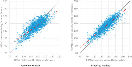The proposed linear regression model for determining HR at IAT was compared to the Karvonen formula (Figure 2). The proposed method shows a lower RMSE (8.77 bpm) than the Karvonen formula (RMSE of 11.2 bpm), and HR determination at IAT is more exact using linear regression.