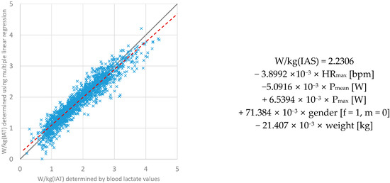 The essential parameter W/kg(IAT), which is especially important for determining changes in performance, was also examined. As explained above, the respective input parameters were iteratively removed unless they met a level of significance p < 0.001. This includes the removal of the heart rate recovery (HRR = HRmax-HR after 5 min of recovery) parameter, as its significance level was p = 0.057. As a result, only the following four parameters were included for multiple linear regression analysis to determine W/kg(IAT): gender; body weight (kg); mean power (Pmean); maximum power (Pmax); maximum HR (HRmax). Using these parameters in multiple linear regression (Figure 3), the determination of W/kg(IAT) is possible with a root mean square error, RMSE = 0.241 W/kg. The adjusted R-squared was 0.897. Figure 3 shows the comparison between W/kg(IAT) values on the horizontal axis determined by means of blood lactate values and the W/kg(IAT) values on the vertical axis determined by means of multiple linear regression.