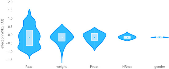 To better understand the impact of individual input parameters on the W/kg(IAT), we have visualized the regression parameters using an effect plot in Figure 4. For this, we multiplied the weights of the formula in Figure 3 with the actual values in our database. The latter are normalized by subtracting their respective mean values, as this offset is already modeled in linear regressions, in our case 2.2306 W/kg.