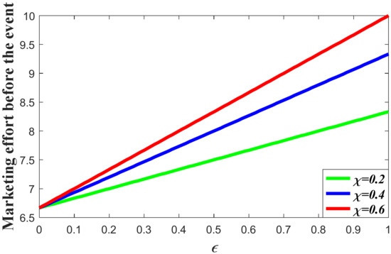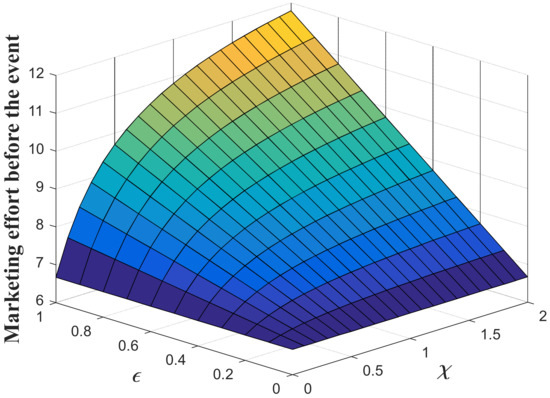 It worth noting that the decisions made by supply chain members in the pre-event regime bear a similar structure compared with those in the post-event regime. Hence, decisions before and after the event have similar properties. For example, marketing decision increases in and . Carbon reduction decision increases in and , and decreases in . We can also learn from Proposition 3 that, different from the optimal decision after the event, the retailer’s marketing decision before the event is influenced by the value of occurrence rate and expansion rate , indicating that, when the favorable event is likely to happen, the retailer should evaluate the possibility and impact of the event when making the decision at the initial time to maximize his long-term profit. In addition, if , which means the favorable event will not happen, the equilibrium marketing decision will be identical to that in Proposition 1. The manufacturer should also take the favorable event and its influence into consideration at the beginning, for his decision is dependent upon goodwill which will be affected by and through marketing effort. After further analyzing the impacts of and on equilibrium decisions, we can have the following corollaries.