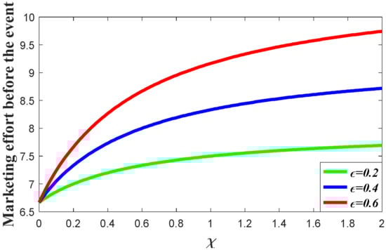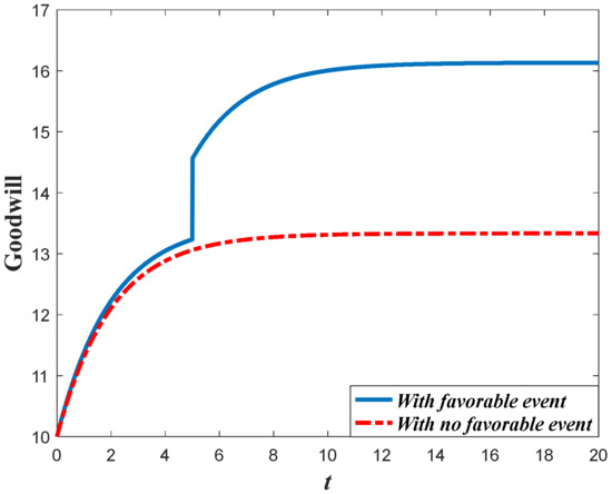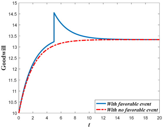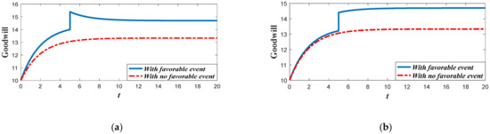 whererepresents the goodwill level right after the event andrepresents the goodwill level right before the event.is the expansion rate of the goodwill level. Since the favorable event can elevate the goodwill level, we use the equation above to depict the influence of the event on the goodwill, which is different from the studies of crisis which exert damage on the goodwill [24,25]. Hence, from the equation above, we can easily find that the goodwill will not be continuous due to the event, which is different from the usual assumptions in the previous literature. Meanwhile, it is also assumed that the event will not only enhance the goodwill level, but will also enhance the marginal effectiveness of the marketing effort on goodwill. Letandbe the marginal effectiveness of marketing effort on goodwill, then we will have.