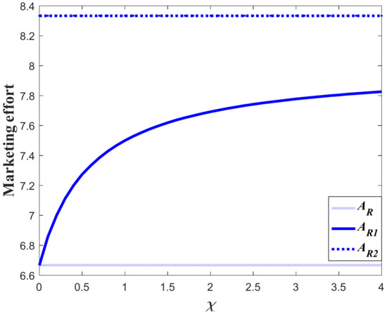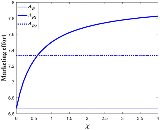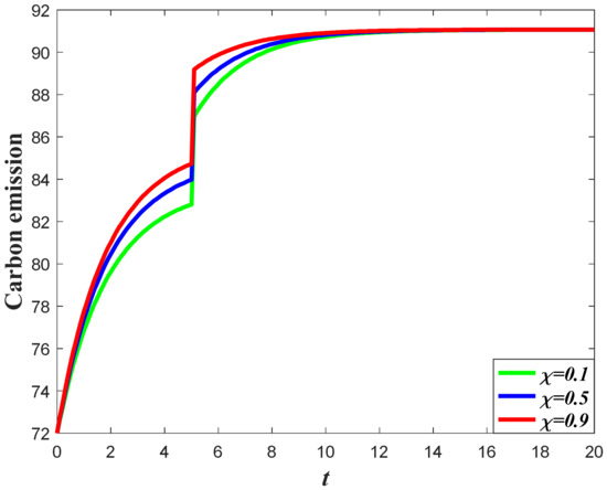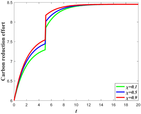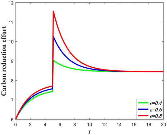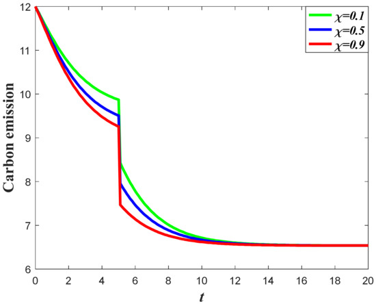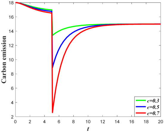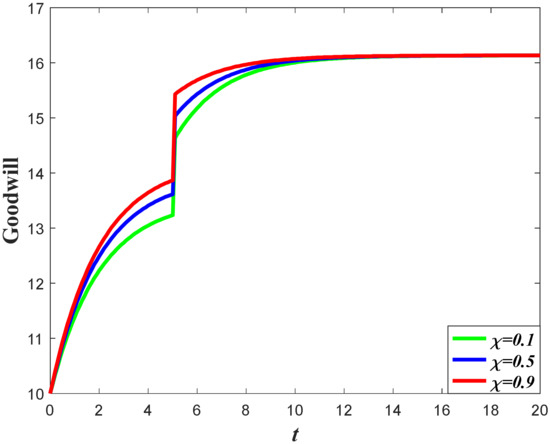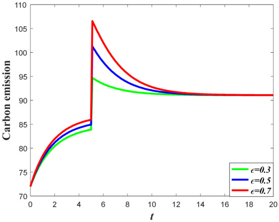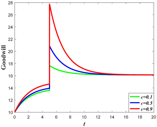 The influence of goodwill on the carbon emissions of the system can be divided into two aspects. For one thing, the increase of goodwill will contribute to the increase of market demand, which will enhance the carbon emission level according to Equation (3). Meanwhile, the optimal carbon reduction effort is the feedback strategy, with regard to the goodwill level, indicating that a higher goodwill level will enhance the carbon reduction effort. The result of Corollary 3 shows that if the value of is relatively large, then the carbon emissions will increase when the goodwill level increases, but if the value of is relatively low, then the increase of the goodwill will contribute to a decrease of emissions.