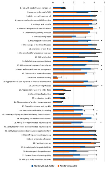Adults with ADHD showed poorer scores on several items of the FCAI as compared with adults without ADHD (Table 3 and Figure 1). Significant differences were specifically found for awareness of the arrival of bills (item 2), knowledge of own income (item 9), a reserve fund for unexpected expenses (item 12), the ability to state long-term financial goals (item 15), own preferences for estate management (item 16), understanding of assets (item 20), legal action for debt (item 23), access to financial advice/counseling (item 26), and the ability to compare medical insurance plans (item 29). These differences are all consistent with the medium-to-large effect sizes that were found (Table 3). For all other items of the FCAI, no significant differences were found between adults with and without ADHD.