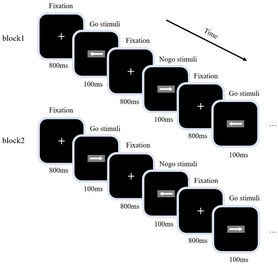 Visual Go/NoGo task diagram. The task was divided into two blocks, each containing 200 trials. Go and NoGo stimuli accounted for 2/3 and 1/3 of all stimuli, respectively; the presentation time of each stimulus was 100 ms and the interval between two adjacent stimuli was 800 ms.