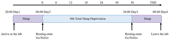 Flowchart showcasing the sleep deprivation experiment, with 60 h of experimental time. Participants entered the laboratory at 20:00 on the first night of the experiment and slept normally in the laboratory. The behavioral and electroencephalogram (EEG) data of the first resting-state and Go/NoGo task were collected at 08:00 on the second day (TSD: 0 h). On the third night, the behavioral and EEG data of the second resting-state and Go/NoGo task were collected after 35.5 ± 1.0 h of sleep deprivation (TSD: 36 h). Participants stayed in the laboratory for restorative sleep on the third night and left the laboratory at 8:00 a.m. on the fourth day.