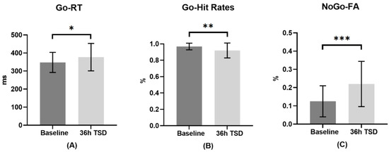 The differences in reaction times (RT) and hit rates in Go trials and false alarms (FA) in NoGo trials at baseline and 36-h total sleep deprivation (TSD). (A): Go-RTs: Go stimulus reaction times at baseline and 36-h TSD; (B): Go-Hit Rates: Go stimulus hit rates at baseline and 36-h TSD; (C): NoGo-FA: NoGo stimulation false alarms at baseline and 36-h TSD. Error bars represent standard deviation. *: p < 0.05, **: p < 0.01, ***: p < 0.001.