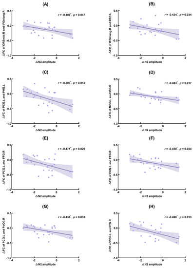 Significant correlation between functional connectivity (FC) changes and N2 amplitude changes. ORBmid.R: right orbital middle frontal gyrus; IFGtriang.R: right triangle inferior frontal gyrus; REC.L: left gyrus rectus; PCG.L: left posterior cingulate gyrus; PHG.L: left parahippocampal gyrus; MOG.L: left middle occipital gyrus; IOG.R: right inferior occipital gyrus; FFG.R: right fusiform gyrus; CUN.L: left cuneus; PoCG.R: right postcentral gyrus; ITG.R: right inferior temporal gyrus. (A): Correlation between ∆FC of ORBmid.R and IFGtriang.R and ∆N2 amplitude; (B): Correlation between ∆FC of IFGtriang.R and REC.L and ∆N2 amplitude; (C): Correlation between ∆FC of PCG.L and PHG.L and ∆N2 amplitude; (D): Correlation between ∆FC of MOG.L and IOG.R and ∆N2 amplitude; (E): Correlation between ∆FC of PCG.L and FFG.R and ∆N2 amplitude; (F): Correlation between ∆FC of CUN.L and FFG.R and ∆N2 amplitude; (G): Correlation between ∆FC of PCG.L and PoCG.R and ∆N2 amplitude; (H): Correlation between ∆FC of PCG.L and ITG.R and ∆N2 amplitude. *: p < 0.05.