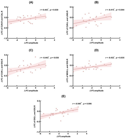 Significant correlation between functional connectivity (FC) changes and P3 amplitude changes. MOG.L: left middle occipital gyrus; IOG.R: right inferior occipital gyrus; CUN.L: left cuneus; CUN.R: right cuneus; CAL.R: right calcarine fissure surrounding cortex; LING.R: right lingual gyrus; IOG.L: left inferior occipital gyrus. (A): Correlation between ∆FC of CUN.R and CAL.R and ∆P3 amplitude; (B): Correlation between ∆FC of CUN.L and LING.R and ∆P3 amplitude; (C): Correlation between ∆FC of CUN.L and IOG.R and ∆P3 amplitude; (D): Correlation between ∆FC of MOG.L and IOG.R and ∆P3 amplitude; (E): Correlation between ∆FC of IOG.L and IOG.R and ∆P3 amplitude. *: p < 0.05; **: p < 0.01.