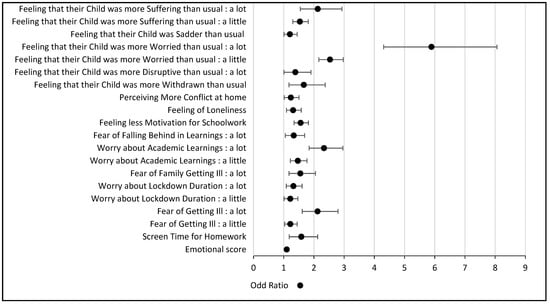In multivariate logistic regression analysis, factors positively associated with feeling more stressed during the lockdown included spending more than 4 h on screens for school purposes (OR = 1.58, 95% CI [1.18; 2.12]), feeling less motivated for schoolwork (OR = 1.56, 95% CI [1.34; 1.82]), and worrying about school learning (OR = 2.34, 95% CI [1.84; 2.96]). Fear of getting ill (OR = 2.12, 95% CI [1.61; 2.80]) or fear of a family member getting ill (OR = 1.55, 95% CI [1.18; 2.05]) was also significantly associated with S+, as was feeling lonely (OR = 1.31, 95% CI [1.09; 1.58]), or witnessing more tension at home (OR = 1.24, 95% CI [1.02; 1.51]).