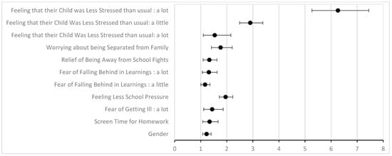 Factors significantly associated with feeling less stressed during the lockdown (Table 1 and Figure 3) were feeling less academic pressure (OR = 1.96, 95% CI [1.71; 2.23]), enjoying being away from school fights or bullying (OR = 1.33, 95% CI [1.09; 1.62]), spending between 2 and 4 h on screens for school purposes (OR = 1. 34, 95% CI [1.08; 1.67]), fear of falling behind academically (OR = 1.31, 95% CI [1.06; 1.63]), fear of being separated from family when going back to school (OR = 1.76, 95% CI [1.41; 2.21]), and fear of getting sick (OR = 1.44, 95% CI [1.12; 1.86]).