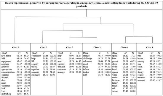 By inserting the text corpus “Health repercussions perceived by nursing workers operating in emergency services and resulting from work during the COVID-19 pandemic”, the DHC returned a formulation of six classes which, after analysis, rendered it possible to form thematic areas, from which the three study categories emerged.