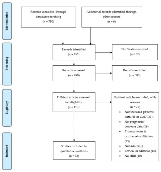 Study selection flow diagram showing number of records identified, screened, excluded, and included as part of the final review. HF = heart failure, CAD = coronary artery disease, HRR = heart rate recovery.