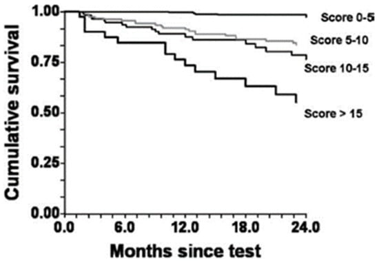 Cumulative survival by Kaplan–Meier analysis for composite risk scores. p < 0.001 by log-rank test. (Adapted with permission from Myers et al. [37]. 2008, Elsevier).