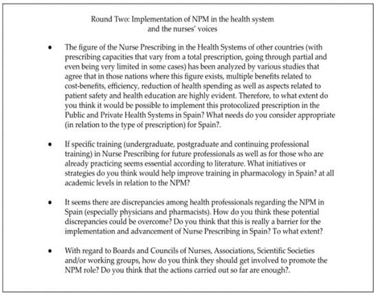 Round Two was constructed based on the results of the first round, with the aim of determining the implementation of the NPM in the Spanish health system, the possible discrepancies between health professionals regarding such implementation, and the involvement of the nurses, associations, societies and other nursing professional organizations. The experts received another email with the results of Round One, and a new file was attached to complete the questions of Round Two. This email was sent in October 2022. See in Figure 2 the questions corresponding to Round Two: